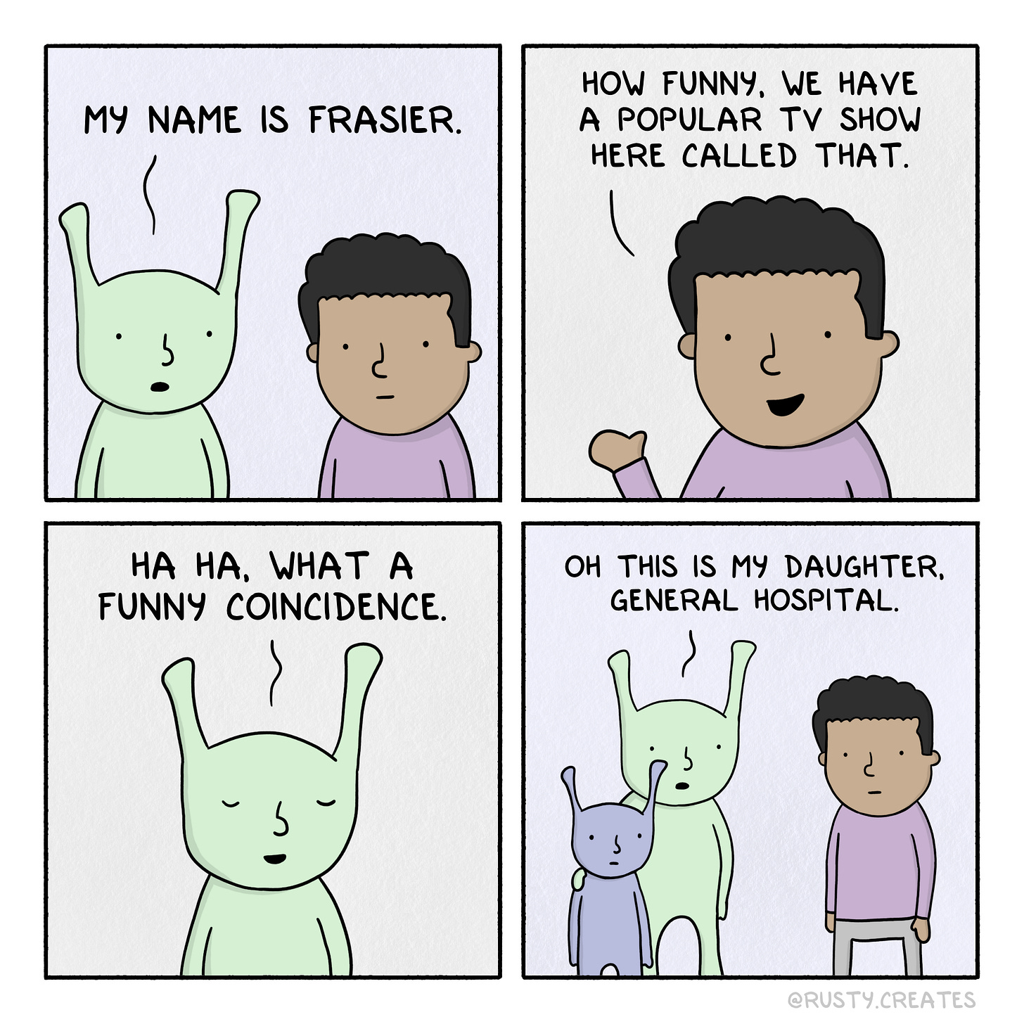 Thank you to my good friend Katya for suggesting General Hospital when I asked her with no context “what TV show would be the dumbest name for a child” (my original idea — Studio 60 on the Sunset Strip — may have been too niche, in retrospect).